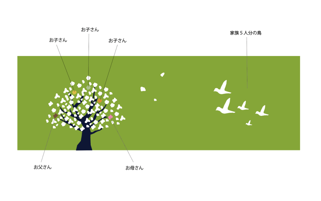5人家族それぞれの花びらの位置は、子供たちは中央に生まれた順番に、そしてお父さん・お母さんは、その子どもたちを両サイドで守るように配置しました。